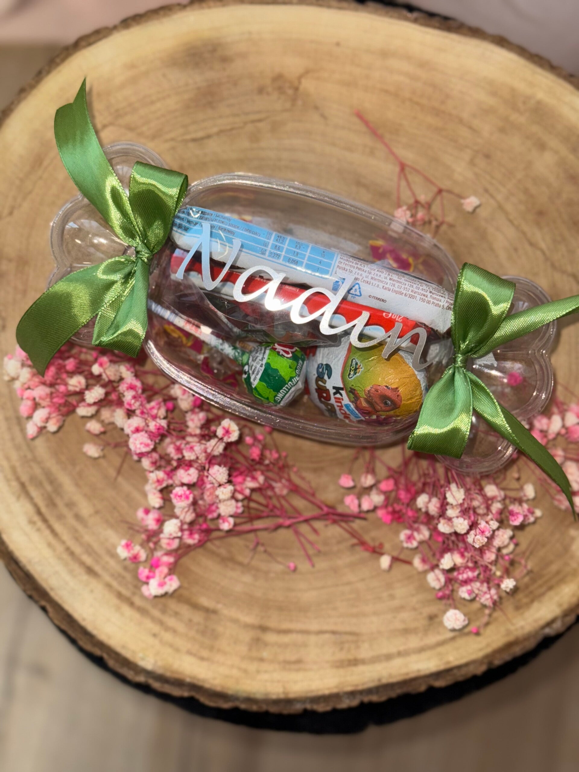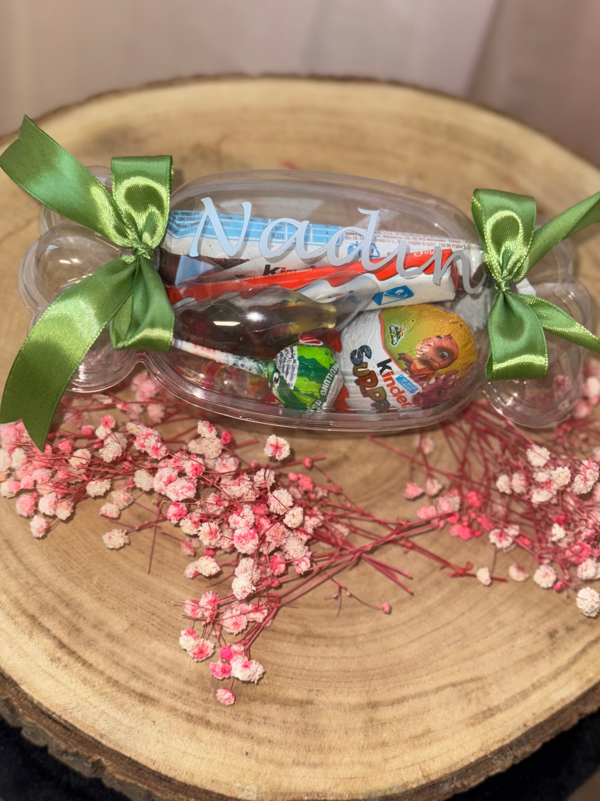 De bak wordt aan de bovenkant voorzien van de naam van het kind en volledig in stijl ingepakt — helemaal klaar om direct cadeau te geven.
