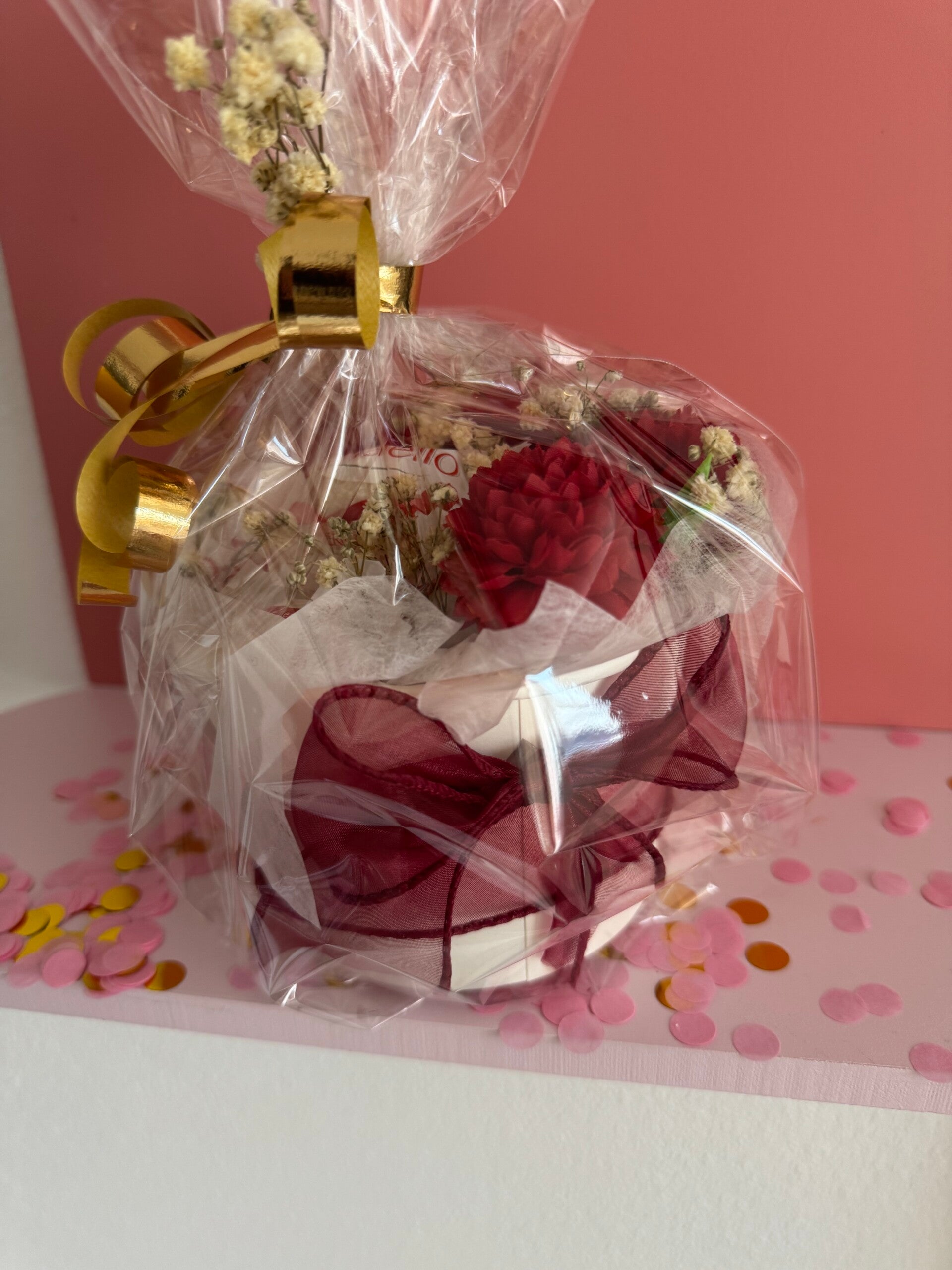 Vier Eid met een stijlvol en liefdevol samengesteld cadeau. Deze prachtige Eid geschenkbox bevat heerlijke Raffaello chocolaatjes, gecombineerd met een elegante mix van rode kunstbloemen en crème gedroogde bloemen. De warme kleuren en verfijnde details zorgen voor een luxe en feestelijke uitstraling. Incl. goude label waar Eid Mubarak op staat.