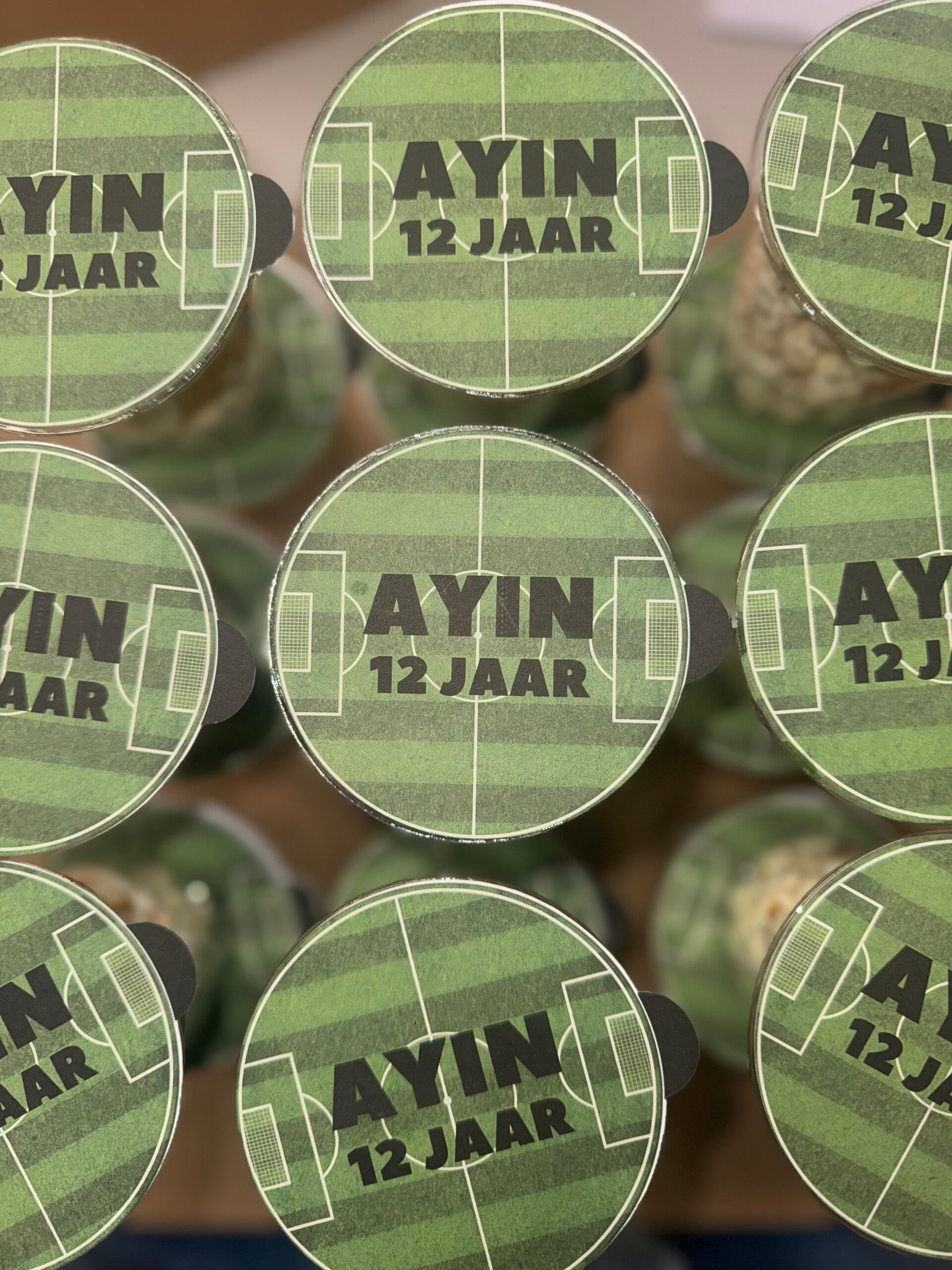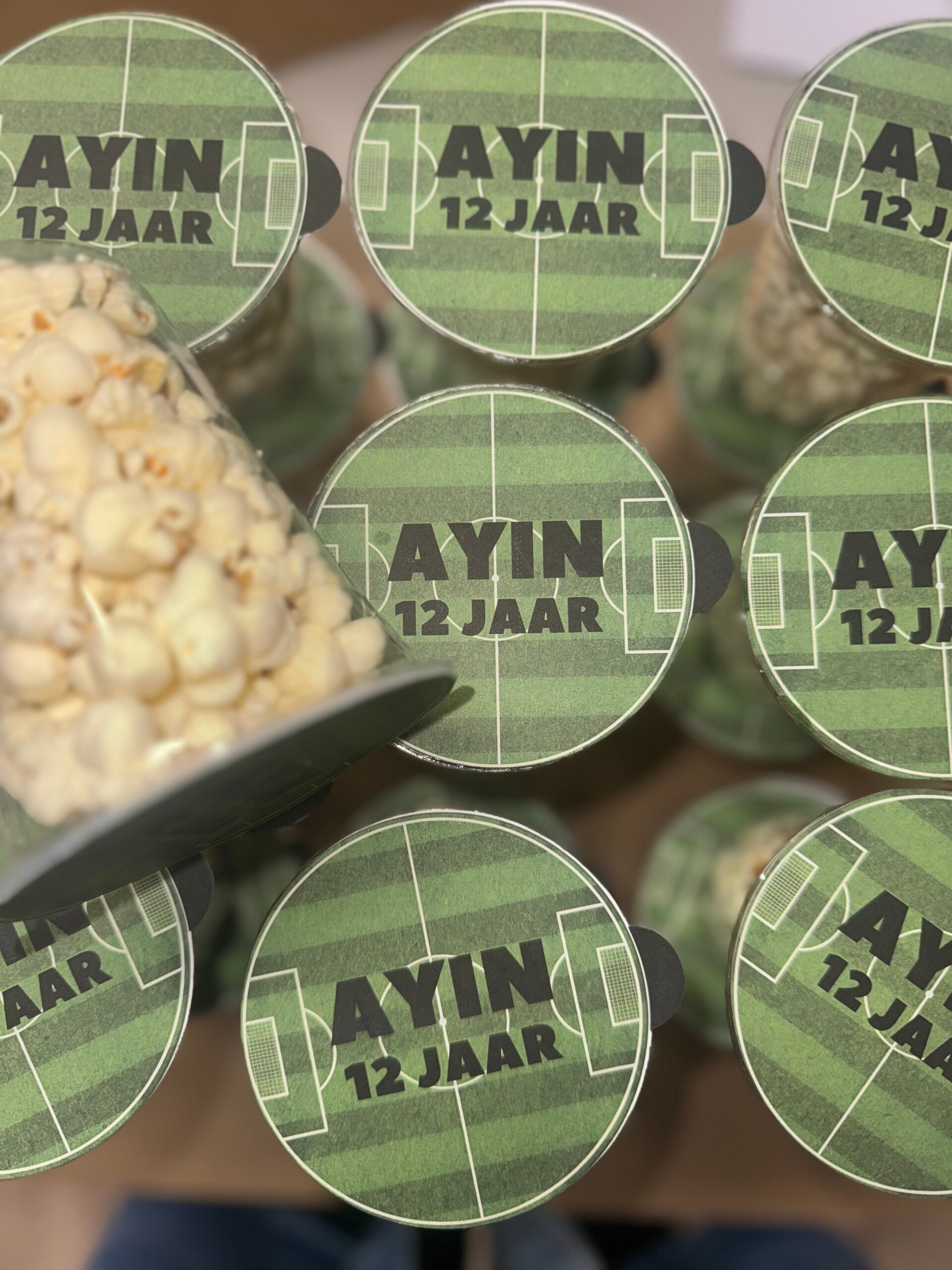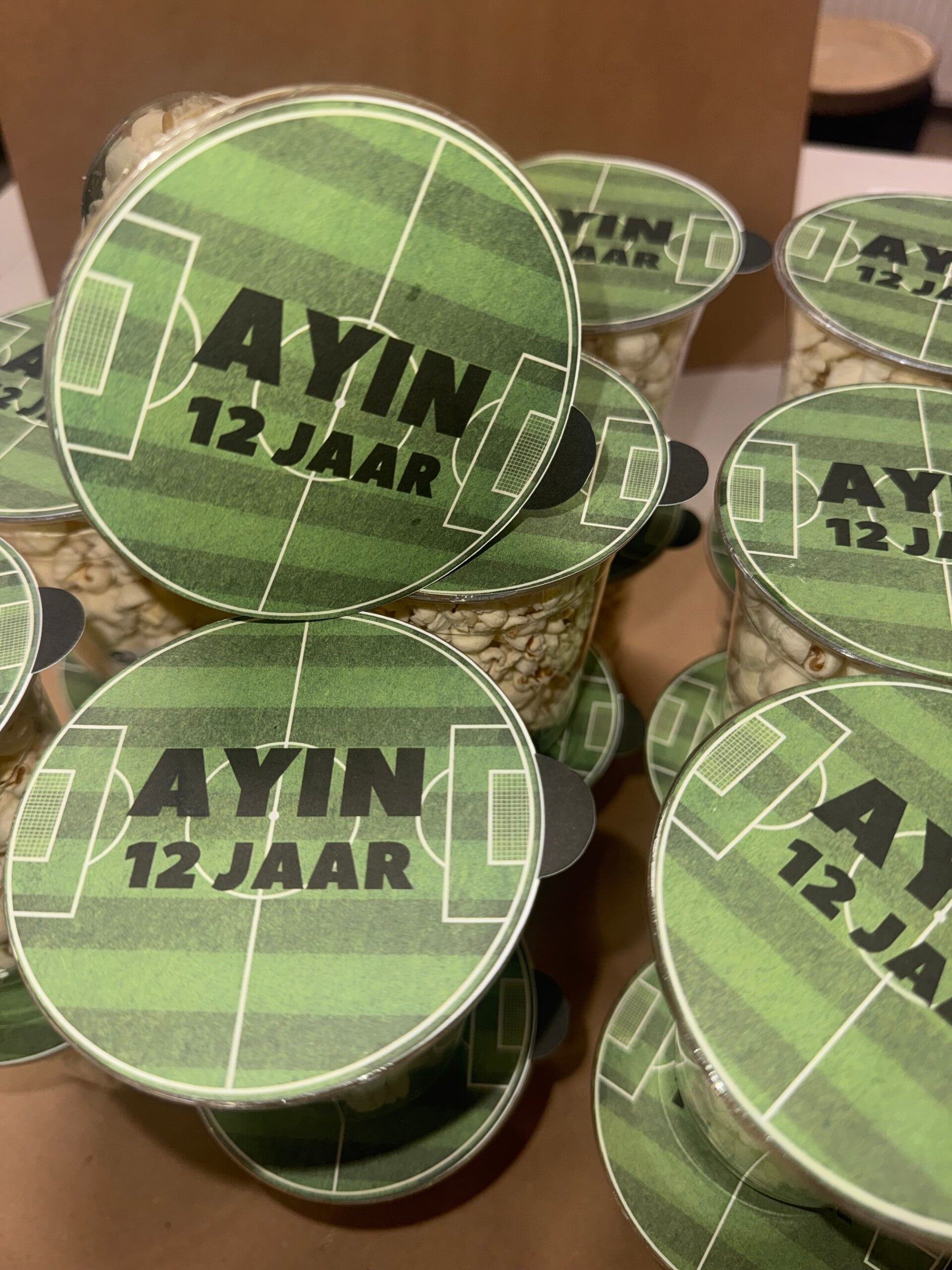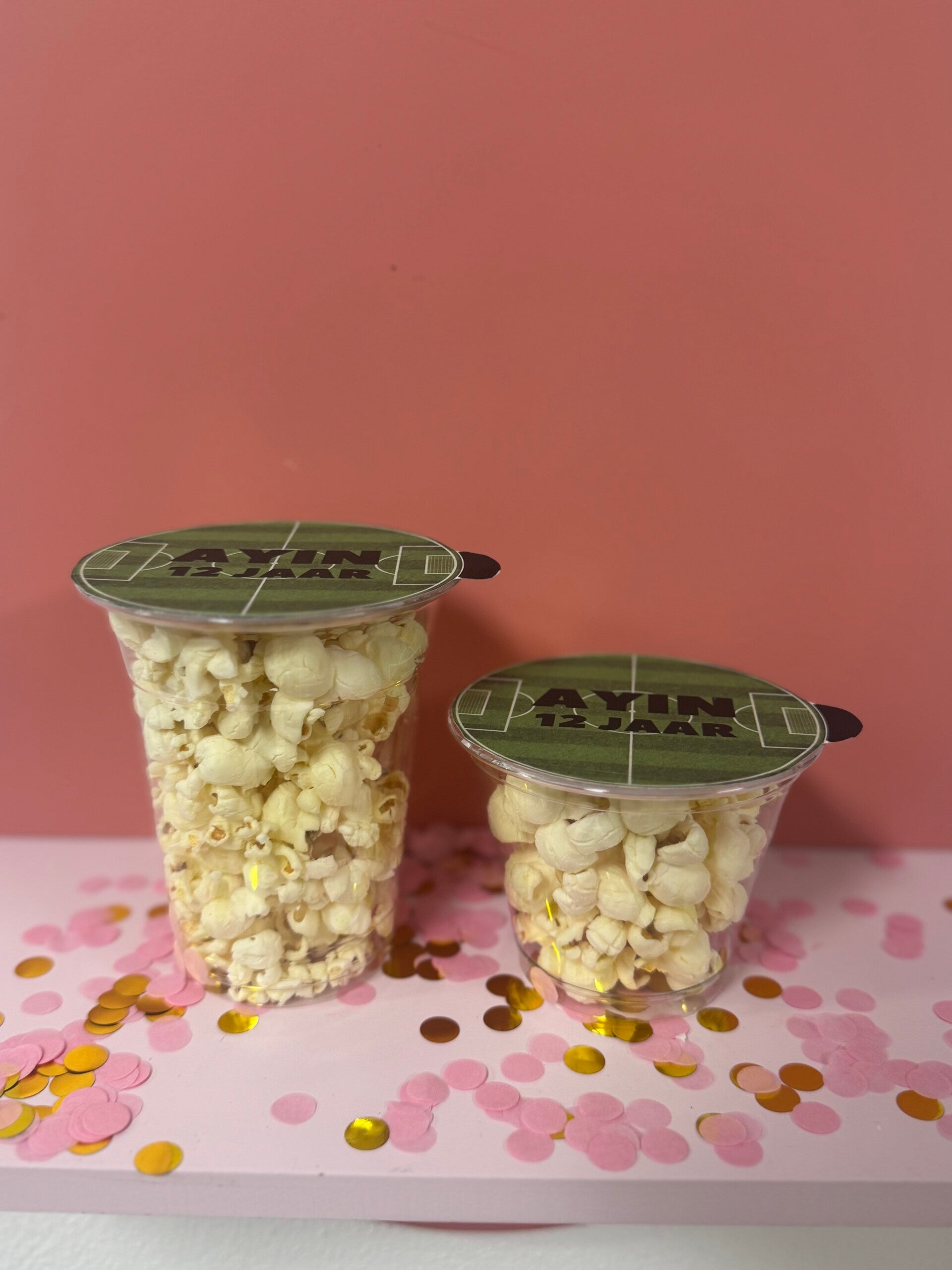 Deze transparante bekers zijn gevuld met heerlijke popcorn en afgewerkt met een gepersonaliseerd deksel in voetbalthema, inclusief naam en leeftijd. Ideaal als traktatie op school, sportclub of kinderfeestje.